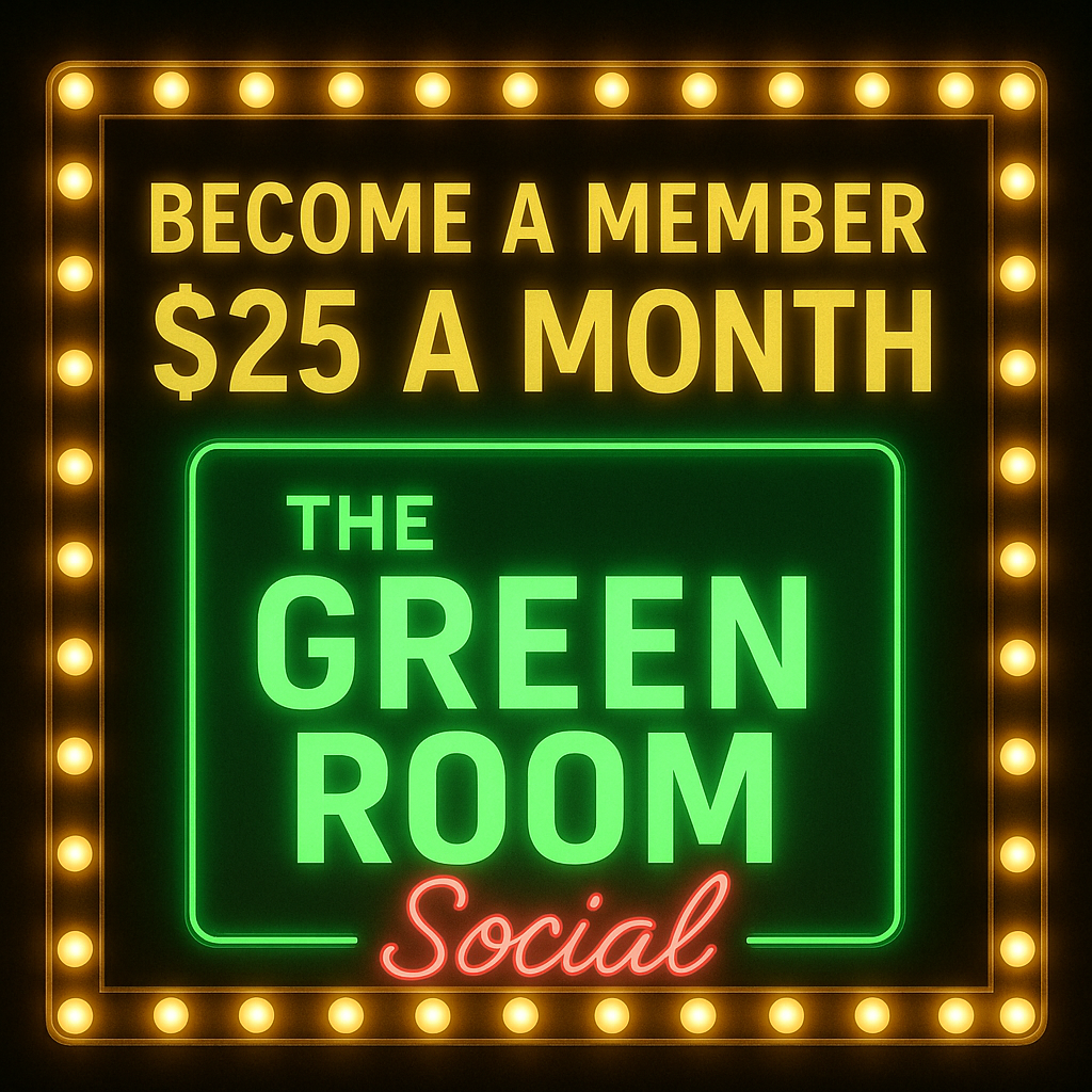 Logo: "THE GREEN ROOM" in green letters, "Social" in pink cursive, within a green-outlined white rectangle.